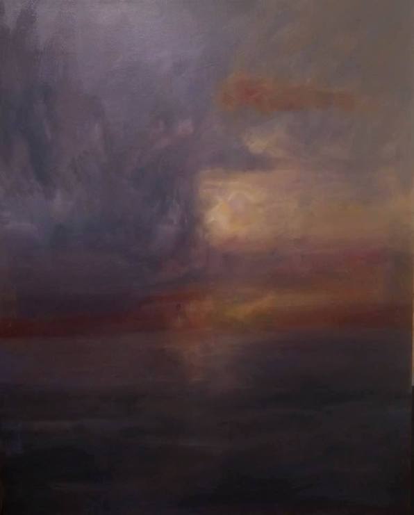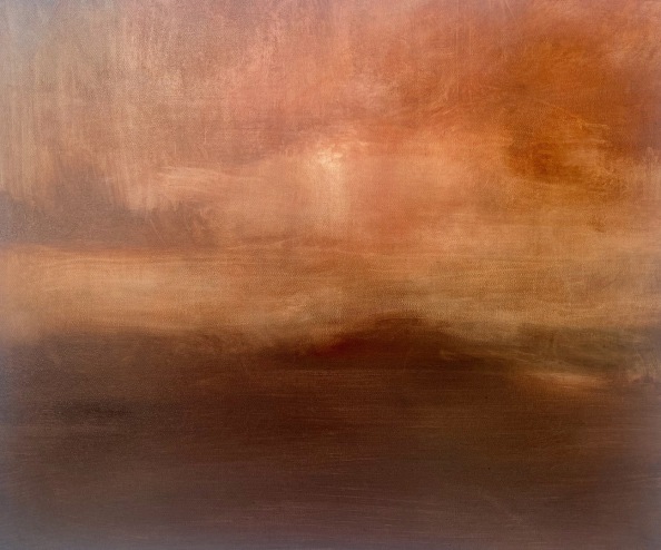 After several trips around the three galleries, to process what was on display, and following stepping outside to smoke once or twice, while gazing across rooftops toward Llanbedrog beach, Cardigan Bay, and the Irish Sea, I then sat “watching” the set of six paintings, the somber and luminous set, expecting them to start moving – the waves to roll, the skies to part, to reveal their secrets. They shared not only somber luminosity but also a depth. The depths extended in some “into the sea” and in others “into the sky” … In some “into both” (sea + sky). In others, “Sea + Sky” were one thing – a totality – horizon present or horizon absent. In the set of six, landscape itself (mountains, shoreline, lake, sea, sky, sun/moon, treeline) receded as luminous horizon or luminous clouds leapt forth. In one of the set of six (Soul of the Mountain), at “stage left” (top left corner), a moon or sun rose/set/fell, appearing to draw with it a torrent of atmospheric chaos (clouds, mist, winged hallucinatory serpents or …). It all “fell” (was falling) into place/not-place, earth and sky “One” ancient urn of infernal and celestial fires.