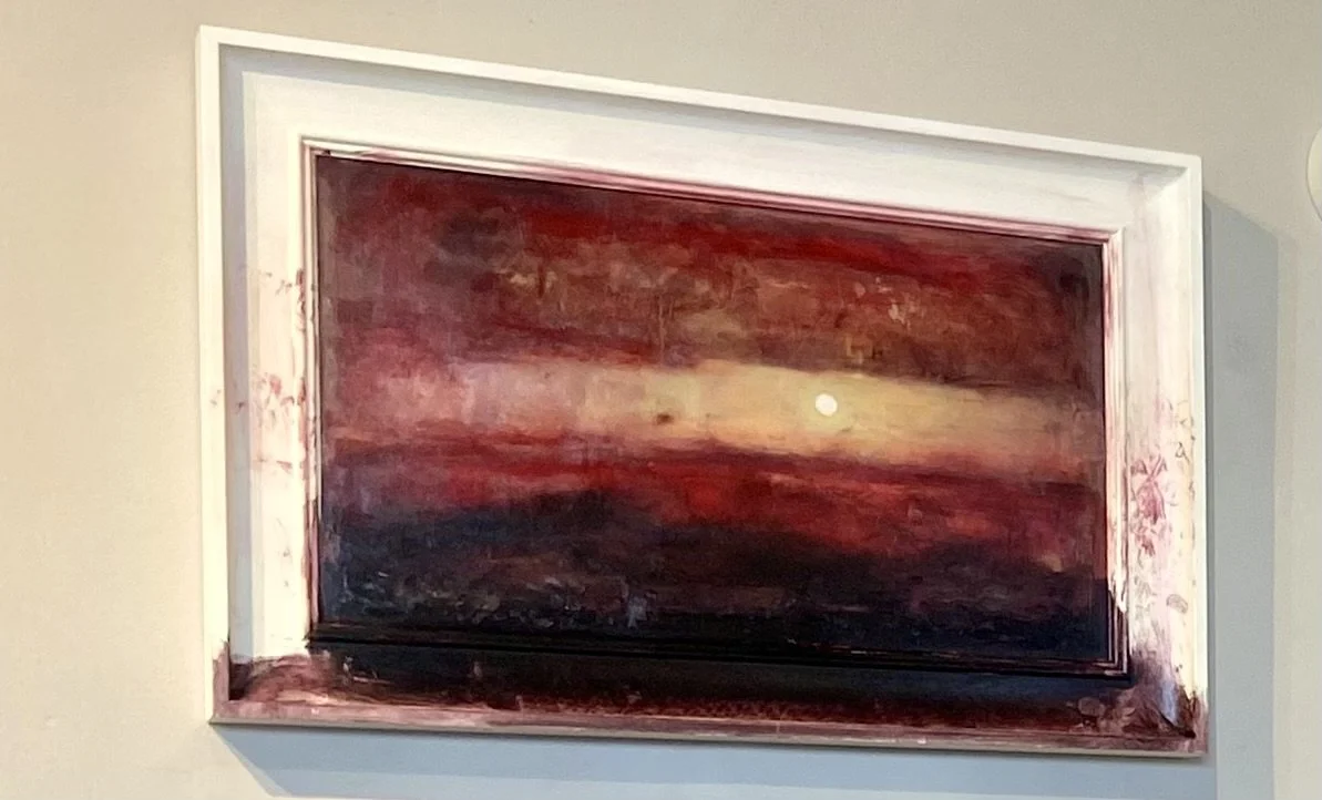 The “bloody canvas” (image of turbulent sea/sky, distant/setting sun/moon in a patch of golden-yellow amidst blood-red sea/sky) overflowed the canvas, spilling on to the white wooden frame, with a few bloody fingerprints for good measure. (It would have been additionally provocative if Jones had left some bloody fingerprints on the gallery wall, the artwork then truly entering into dialogue with the room …) Traces of human figures behind the sea/skyscape were barely discernible or “not there” at all – hallucinations inferred or hallucinations incurred. Jones somehow managed to tap into that “somatic” effect (affective and/or mythic reserve) of the Welsh landscape I felt upon arrival, upon all arrivals in Northwest Wales since my first arrival in 2013; an affective register in landscape that spoke to me of various things, but foremost of “Sea + Sky” as selfsame register, at some level, of “Fate + Grace.”