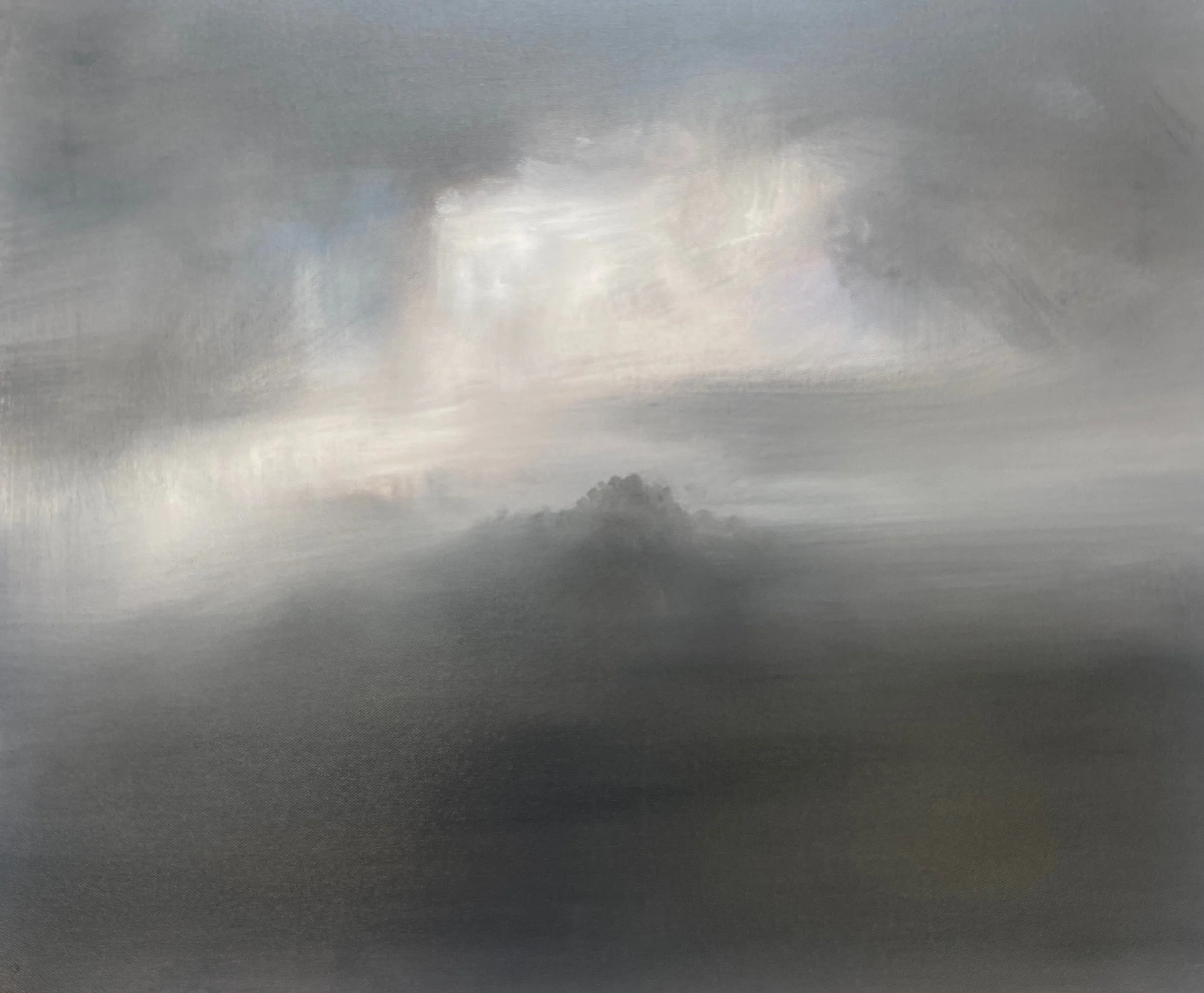 Northwest Wales has what I can only call a somatic effect on my body and mind. It has partly to do with my repeated visits since 2013, but it also has something to do with a mythic dimension in “time-space” that defies categorization. This was confirmed when I visited an exhibition at Plas Glyn-y-Weddw in Llanbedrog on October 29. The exhibition, featuring paintings by five artists, was billed as “A joint exhibition of landscape and figurative art inspired by Welsh poets, industrial and cultural heritage.” Yet, the part that drew my immediate attention was the work of Pete Jones, assembled under the title “Tu Hwnt i’r Mynyddoedd / Beyond the Mountains.” And, amidst several dozen paintings by Jones (forty-one to be precise), the part within the part that truly drew my attention was a “set” of six paintings of dark and sombre, luminous landscapes featuring “Sea + Sky.” The larger corpus of works was spread across three galleries, whereas this set of six paintings shared the wall of one gallery as if they were inseparable. All of the other works on view by Jones departed from the six luminous, nearly monochromatic works that focused on something in the landscape of Northwest Wales that spoke to that somatic effect “being in Northwest Wales” had on my body and mind.