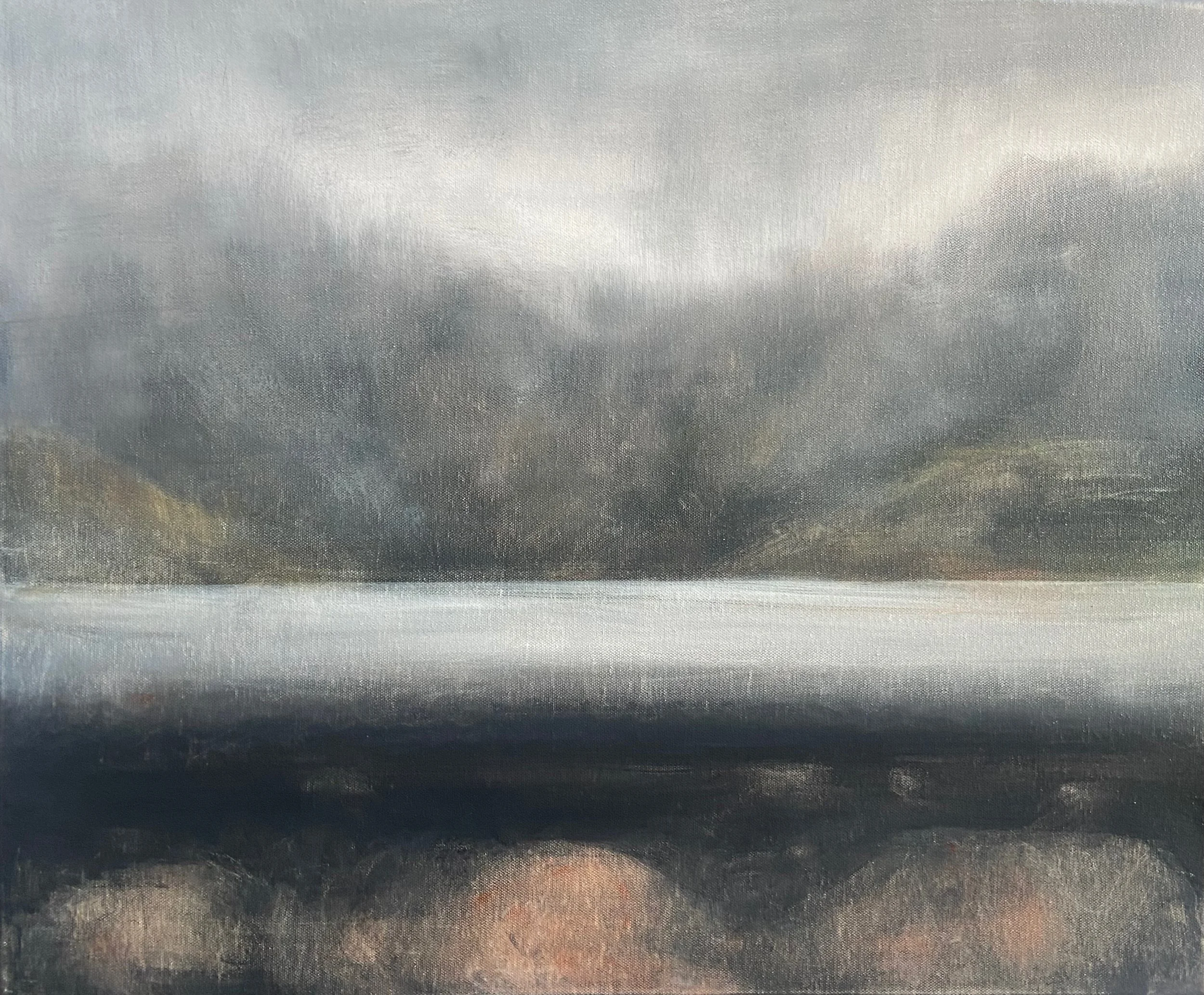 The six paintings (all oil on canvas) were: Soul of the Sea (122x91cm); Under the Mountain Lake (61x51cm); Soul of the Mountain (122x91cm); “Bird on the Winter Sea” (61x51cm); Carnedd (61x51cm); and Y swnt (67x54cm). The press release (flyer) for “Tu Hwnt i’r Mynyddoedd / Beyond the Mountains” included a sequence of provocative statements regarding influences intended to set the work in that mythic reserve I suspected being responsible for my somatic reaction to Northwest Wales. Also playing in the main two galleries was what could only be called “ambient music,” composed by Jones. It, too, was entitled “Tu Hwnt i’r Mynyddoedd” (2024). Low enough in volume to be unobtrusive, it nonetheless added to the spell cast by that set of six paintings.