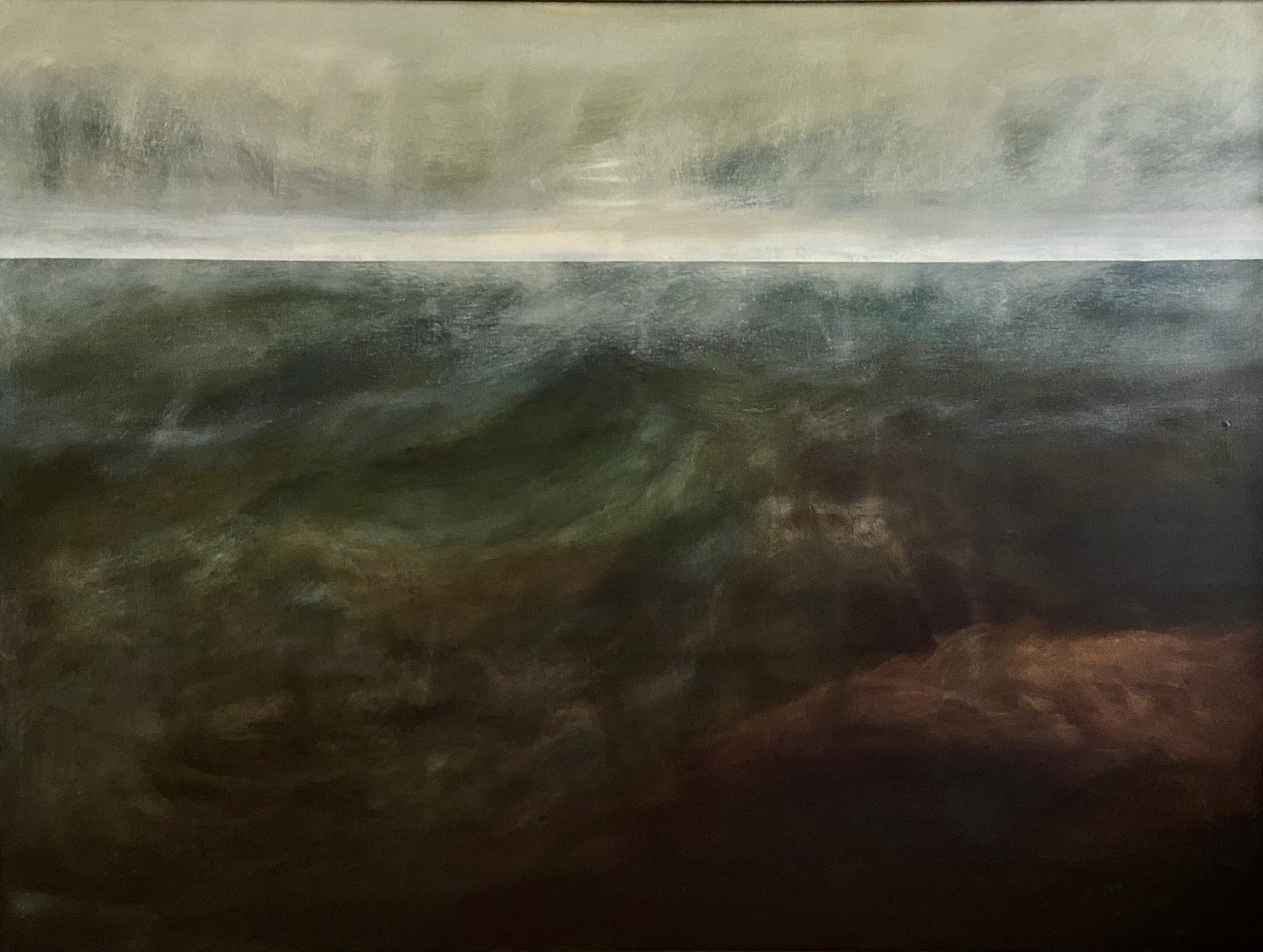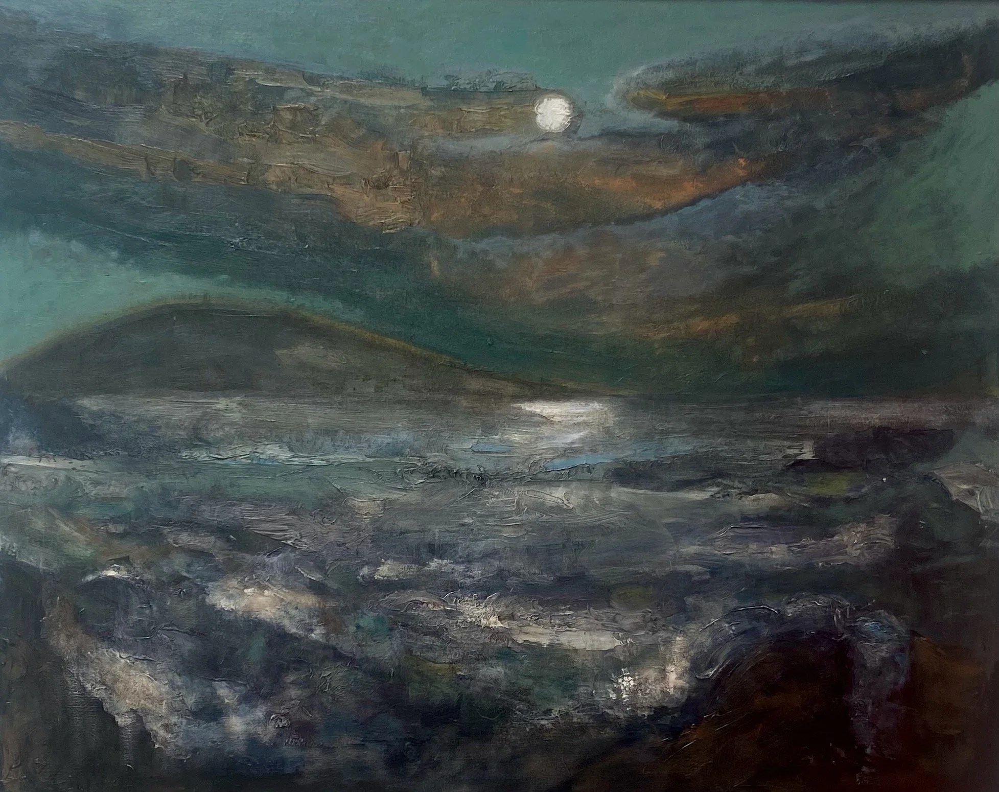 After several trips around the three galleries, to process what was on display, and following stepping outside to smoke once or twice, while gazing across rooftops toward Llanbedrog beach, Cardigan Bay, and the Irish Sea, I then sat “watching” the set of six paintings, the somber and luminous set, expecting them to start moving – the waves to roll, the skies to part, to reveal their secrets. They shared not only somber luminosity but also a depth. The depths extended in some “into the sea” and in others “into the sky” … In some “into both” (sea + sky). In others, “Sea + Sky” were one thing – a totality – horizon present or horizon absent. In the set of six, landscape itself (mountains, shoreline, lake, sea, sky, sun/moon, treeline) receded as luminous horizon or luminous clouds leapt forth. In one of the set of six (Soul of the Mountain), at “stage left” (top left corner), a moon or sun rose/set/fell, appearing to draw with it a torrent of atmospheric chaos (clouds, mist, winged hallucinatory serpents or …). It all “fell” (was falling) into place/not-place, earth and sky “One” ancient urn of infernal and celestial fires